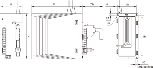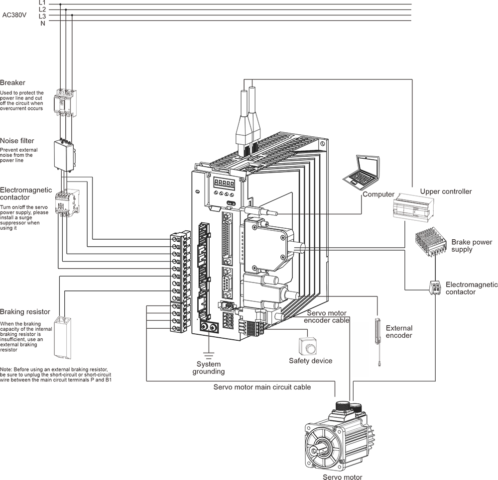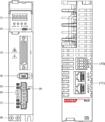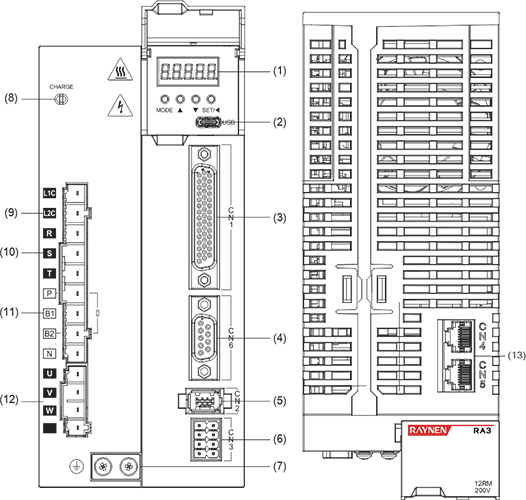 | Deskripsi: ① Tampilan tabung digital: tabung digital LED 5 digit 8 segmen ②USB: Antarmuka USB Type-C, terhubung ke PC ③CN1 (konektor antarmuka): port koneksi sinyal keluaran/input, terhubung ke pengontrol yang dapat diprogram (PLC) atau kontrol I/O ④Konektor encoder loop tertutup penuh: antarmuka loop tertutup penuh, terhubung ke encoder kedua eksternal, model '-FS' mendukung fungsi ini ⑤CN2 (konektor encoder): antarmuka encoder, terhubung ke encoder pada motor servo ⑥L1, L2, L3 (terminal input daya utama): catu daya sirkuit utama, catu daya fase tunggal dihubungkan antara L1 dan L2 (200~240VAC, catu daya 50/60Hz) ⑦L1C, L2C (kontrol input daya elektronik): catu daya sirkuit kontrol, terhubung ke catu daya fase tunggal (200~240VAC atau 380~440VAC, catu daya 50/60Hz sesuai model) ⑧R, S, T (terminal input daya utama): Catu daya sirkuit utama, sambungkan ke catu daya tiga fase (catu daya 200~240VAC atau 380~440VAC, 50/60Hz sesuai model) ⑨P, B (terminal sambungan resistor pengereman eksternal): gunakan resistor pengereman eksternal ⑩P, B1, B2 (terminal sambungan resistor pengereman eksternal): gunakan resistor pengereman eksternal (lepaskan bagian korslet antara P dan B1, sambungkan ke kedua ujung P dan B2) ⑪P, N (N1, N2) (terminal bus servo): jangan lepaskan bagian korslet antara N1 dan N2, sambungkan antara P dan N (N1) untuk beberapa servo untuk berbagi bus DC ⑫N1, N2: sambungkan reaktor DC eksternal (lepaskan bagian korslet), korsleting saat tidak digunakan ⑬U, V, W, PE (terminal koneksi motor servo): output penggerak servo, terhubung ke konektor daya motor (U, V, W, PE) ⑭ Sekrup grounding: Hubungkan ke ground listrik dan ground motor ⑮CHARGE (indikator tegangan bus): indikator daya ⑰CN3 (konektor untuk fungsi keselamatan): Antarmuka STO, hanya model '-S/FS' yang mendukung fungsi ini ⑱CN4/CN5 (terminal komunikasi): port komunikasi 485, port komunikasi kecepatan tinggi EtherCAT, port komunikasi CAN | |||||||||